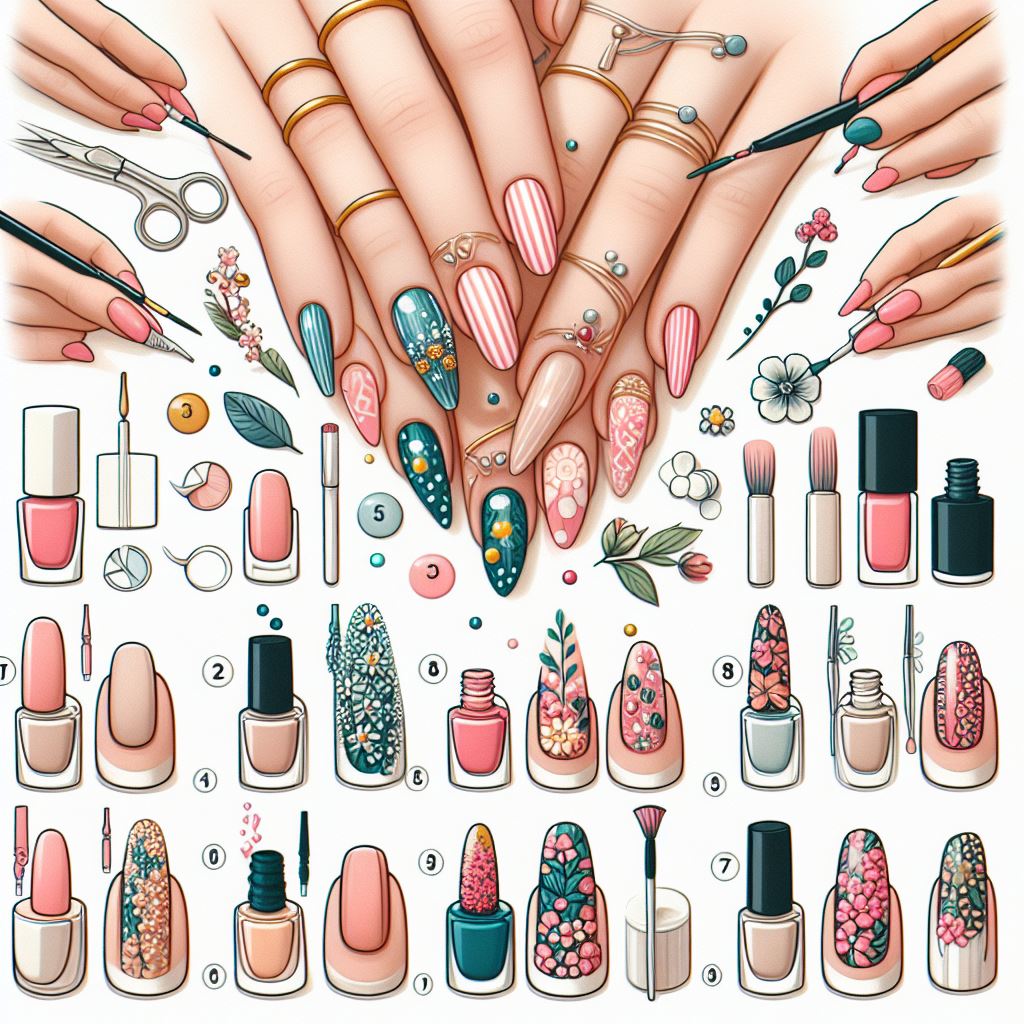 Once you have everything gathered together, start by painting your nails with a base coat. This will help protect your nails and provide a smooth surface for the nail art design. Once the base coat is dry, start working on your design.